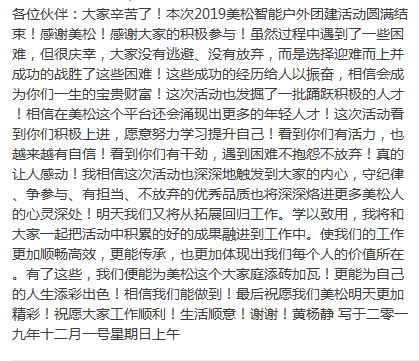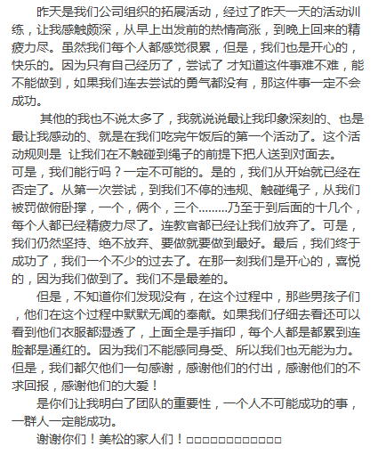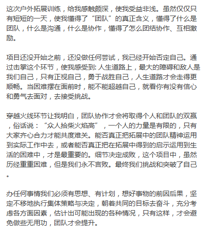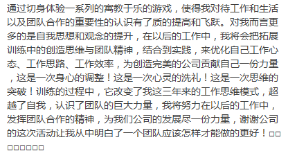 本次活動,同事們在實踐鍛煉中學習,在體驗學習中改變,受益匪淺,有了更多的人生感悟。在體驗著奉獻、協(xié)作、勇敢?guī)淼某晒ο矏偤?,每個人深刻感受到|溝通、責任、協(xié)作、勇敢、自信|的精髓,以及作為團隊中的一員所要承擔的責任,正如美松智能總經(jīng)理黃楊靜先生及同事們所言,利用周日休息天還在撰寫感悟傳遞著: