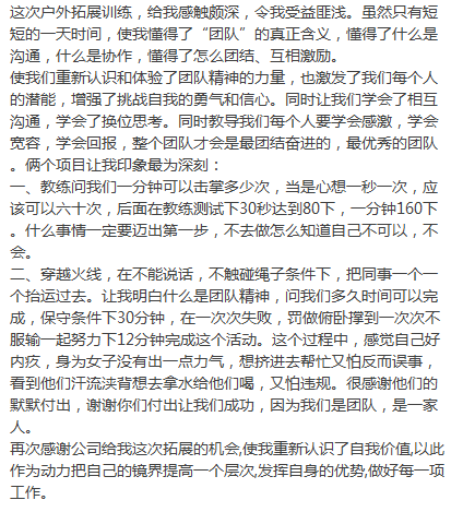 此次拓展團建活動,不僅培養(yǎng)了大家的積極的工作態(tài)度和高度的工作責任心,充分開發(fā)了個人潛力,還讓大家深刻體會到了團隊的力量以及相互溝通協(xié)作的重要性,這為以后的工作奠定了很好的基礎。離開了拓展訓練基地,回到更為廣闊的工作環(huán)境,我們相信,只要我們充分發(fā)揮拓展活動中互助互信的團隊精神,把每一件工作當作是拓展訓練中的一次挑戰(zhàn),就沒有戰(zhàn)勝不了的困難,沒有解決不了的難題!