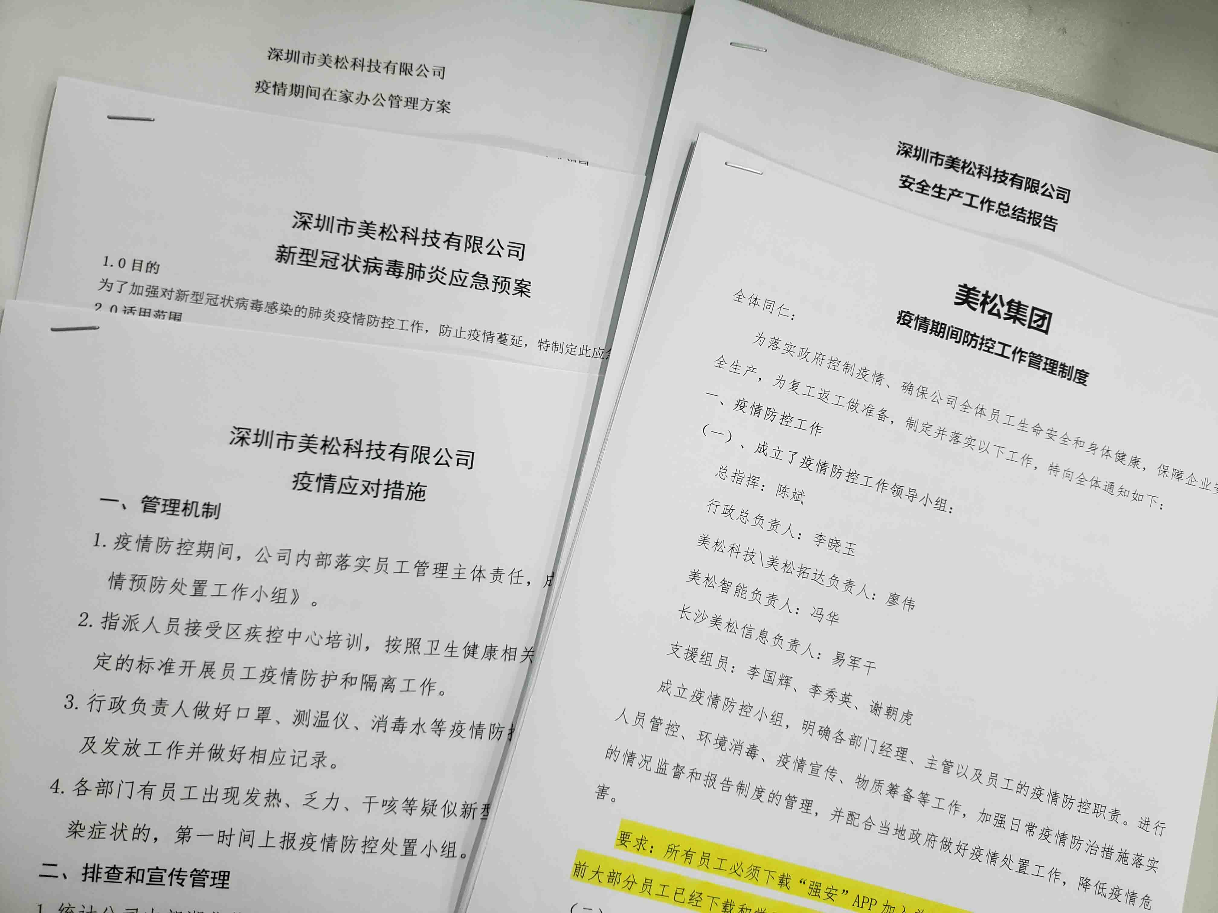 開工復(fù)工在即,我們美松集團(tuán)及各下屬子公司也做了充分準(zhǔn)備工作,面對(duì)如此特殊疫情時(shí)期,深圳美松集團(tuán)特制定了《疫情期間防控工作管理制度》、《疫情期間在家辦公管理方案》、《安全生產(chǎn)工作報(bào)告》、《應(yīng)對(duì)疫情應(yīng)對(duì)措施》、《新型冠狀病毒應(yīng)急預(yù)案》,利用網(wǎng)絡(luò)、電話、現(xiàn)場(chǎng)等多種形式相結(jié)合的方式為客戶提供服務(wù),保障客戶需要,通過差異化的管理,做到疫情防控和經(jīng)營服務(wù)“兩不誤”。無論是在家辦公,還是到崗辦公,全體員工全身心投入到工作當(dāng)中,保持著積極的工作熱情。