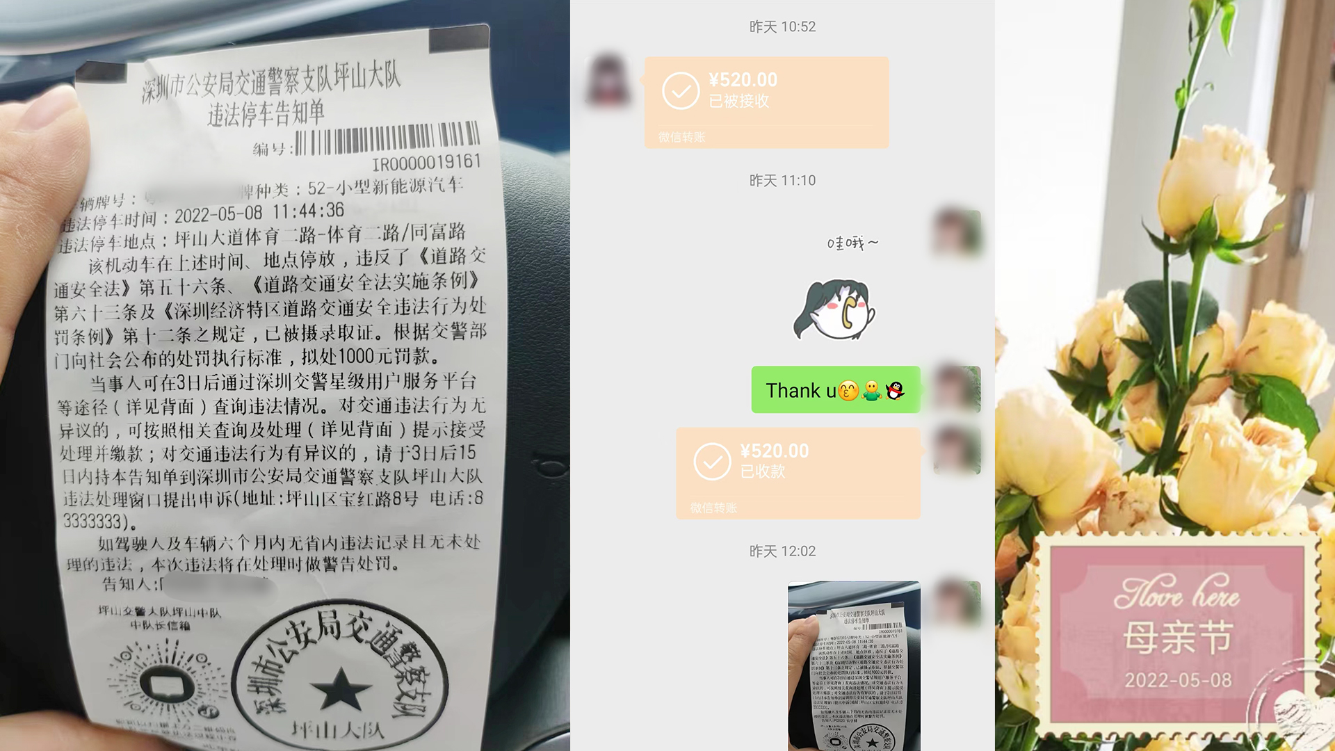這次母親節(jié)活動我有點不解,不僅微信紅包的金額沒有擴大,還沒有默認紅包母親節(jié)快樂的祝福語,但是這也阻擋不了對母親的愛。下面這位母親在母親節(jié)收到了520的轉賬,但是出了點意外,母親節(jié)外出和朋友聚餐,不小心違反了交通規(guī)則,收到了違法停車告知單,被罰1000元罰款。我認為這位母親也是收到了最好的禮物,畢竟我看大部分人都只是發(fā)紅包,這個轉賬最直觀的表達:我愛你,母親!
