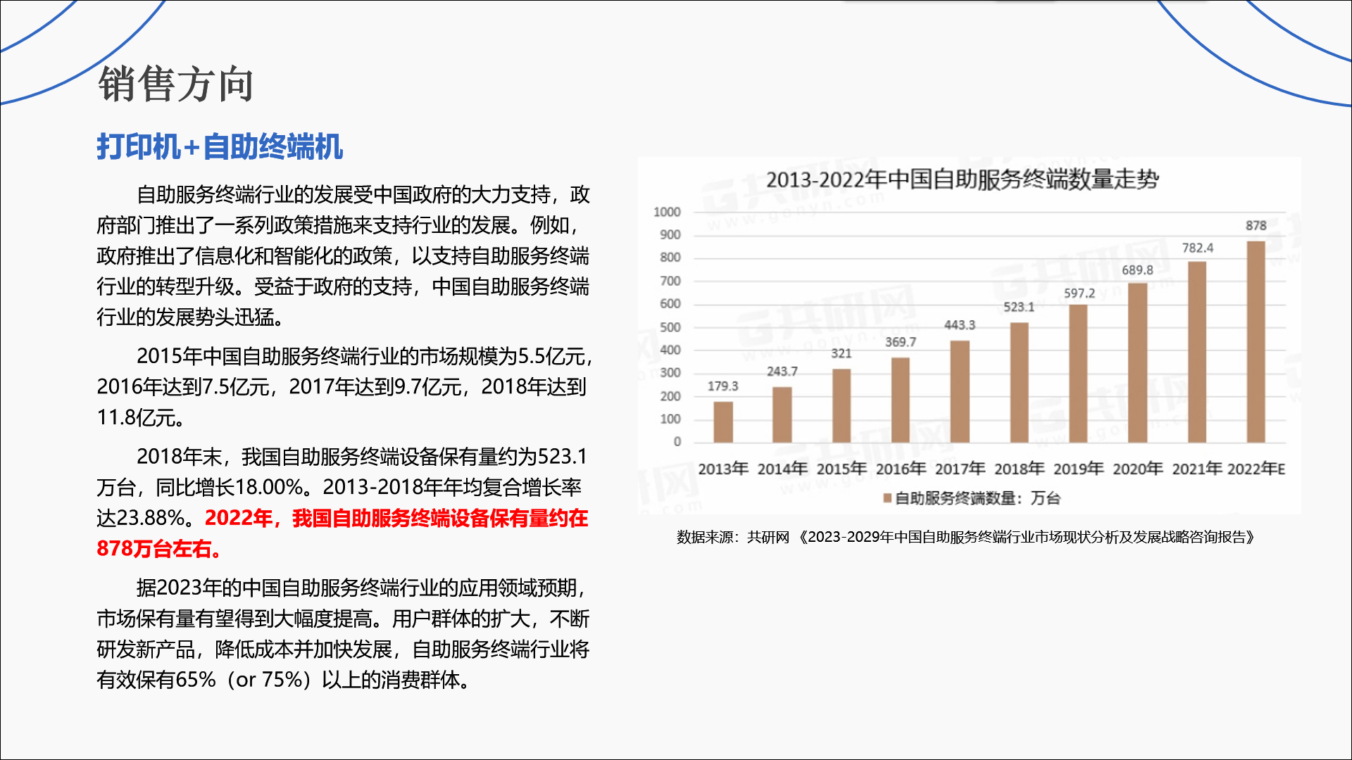 自助服務(wù)終端行業(yè)的發(fā)展受中國政府的大力支持,政府部門推出了一系列政策措施來支持行業(yè)的發(fā)展。例如,政府推出了信息化和智能化的政策,以支持自助服務(wù)終端行業(yè)的轉(zhuǎn)型升級。受益于政府的支持,中國自助服務(wù)終端行業(yè)的發(fā)展勢頭迅猛。201 5年中國自助服務(wù)終端行業(yè)的市場規(guī)模為5.5億元,2016年達(dá)到7.5億元,2017年達(dá)到9.7億元,2018年達(dá)到11.8億元。201 8年末,我國自助服務(wù)終端設(shè)備保有量約為523.1萬臺,同比增長18.00%。2013-2018年年均復(fù)合增長率達(dá)23.88%。2022年,我國自助服務(wù)終端設(shè)備保有量約在878萬臺左右。