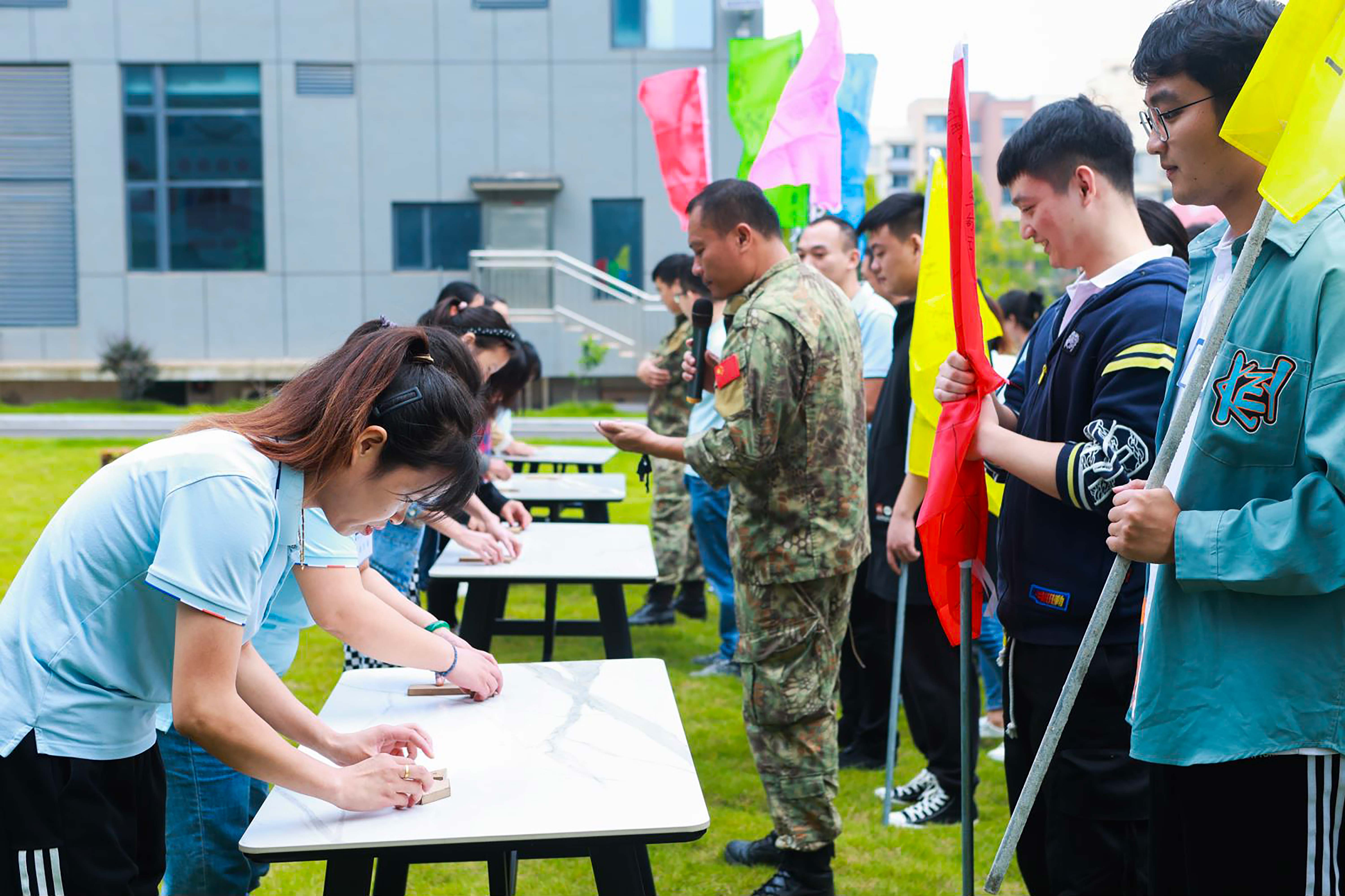一聲哨響,全體長沙美松人于7:50準時在園區(qū)草坪內(nèi)集合,在美松信息總經(jīng)理黃尤川先生的開場講話中拉開了本次特訓營活動的帷幕,一張張笑臉在初秋的陽光照射下顯得格外美麗與帥氣。生活需要儀式感,工作需要歸屬感,在4名專業(yè)的教練組織安排下,快速組成16支隊伍。集眾人智慧,濃縮創(chuàng)新意識,在各隊長的帶領(lǐng)下分別給自己的戰(zhàn)隊制定隊名、設計隊徽、確定口號、排練隊形、自我介紹,員工們迅速打開心扉并了解自己的同伴,隊旗一飄,無盡風采,個個都神采奕奕!瞧!我們的麒麟隊,口號一響,臨危受命,舍我其誰?!