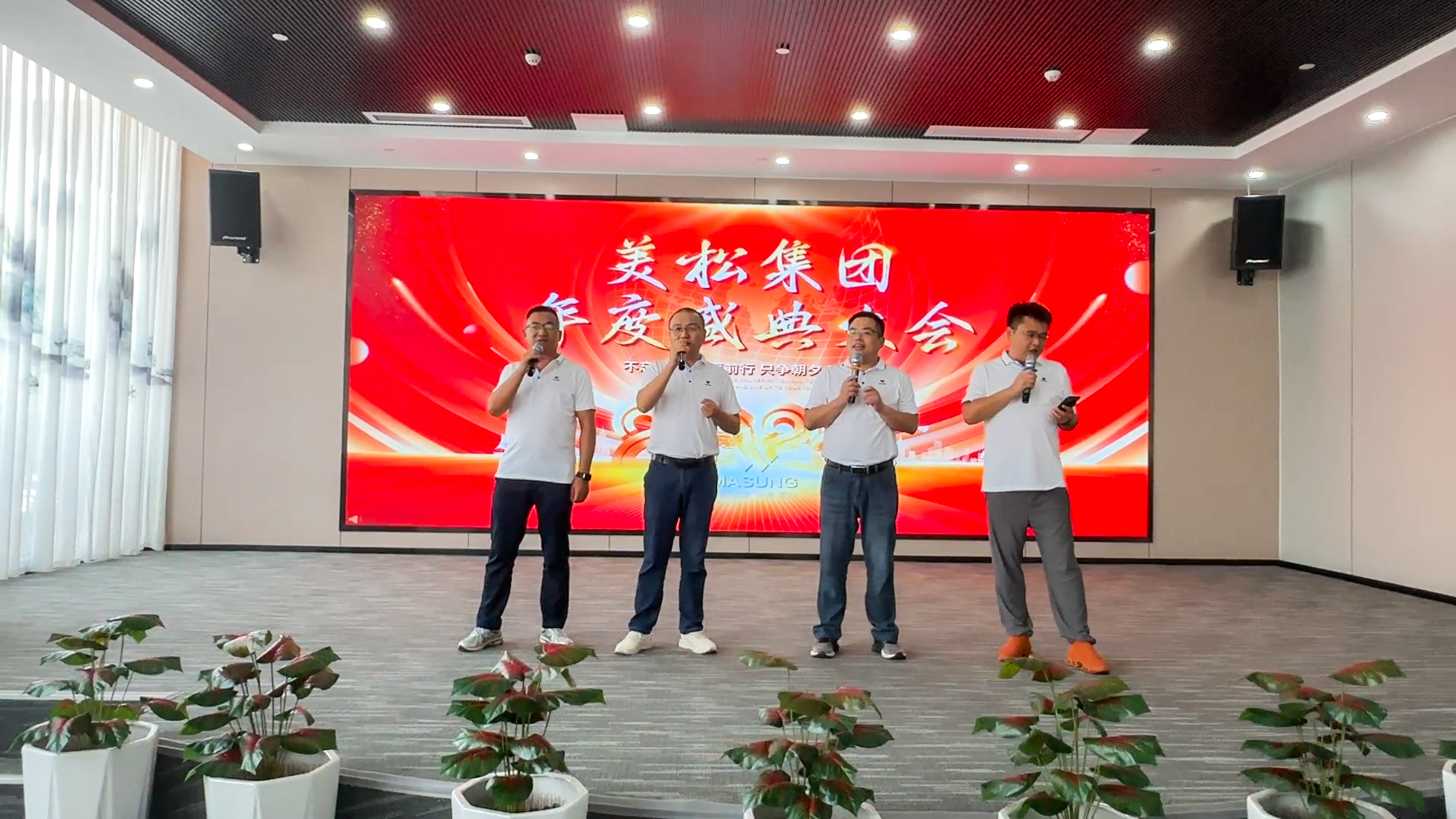 四位主持人整齊亮相開(kāi)啟序幕,由美松智能銷(xiāo)售部總經(jīng)理李光輝帶領(lǐng)的” 四大金剛”上臺(tái)領(lǐng)唱美松主題曲《我的夢(mèng)》,當(dāng)歌聲響起,現(xiàn)場(chǎng)激勵(lì)氣氛高漲。