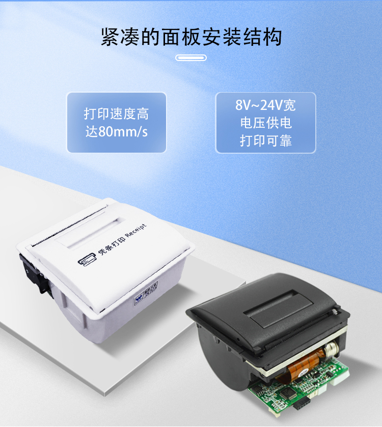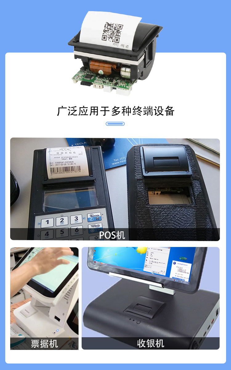 微型打印機(jī)特點(diǎn):前開(kāi)蓋維護(hù),無(wú)需拆開(kāi)終端設(shè)備就可實(shí)現(xiàn)換紙和維護(hù),8V~12V低電壓供電58mm打印機(jī),嵌入體積小巧