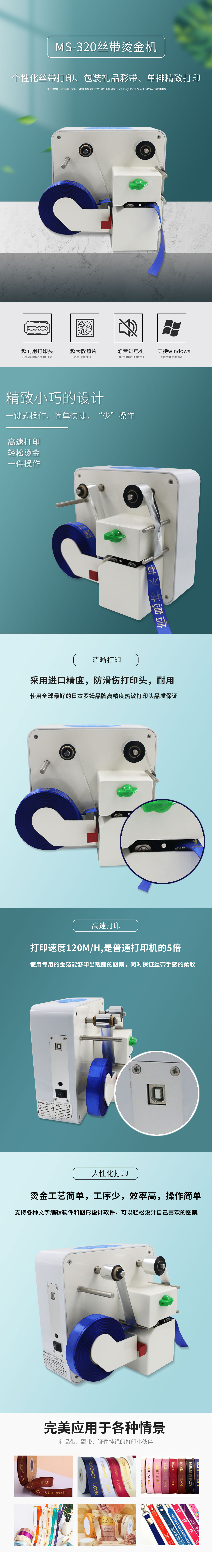 美松全自動(dòng)絲印機(jī) 1.機(jī)器體積小巧,美觀(桌面擺設(shè)) 2.速度快(是普通打印機(jī)的5倍) 3.在絲帶上打印精美的圖案,文字,標(biāo)志 4.使用專用的金箔能夠印出靚麗的圖案,同時(shí)保證絲帶手感的柔軟 5.支持各種文字編輯軟件和圖形設(shè)計(jì)軟件,自定義打印商標(biāo)和文字