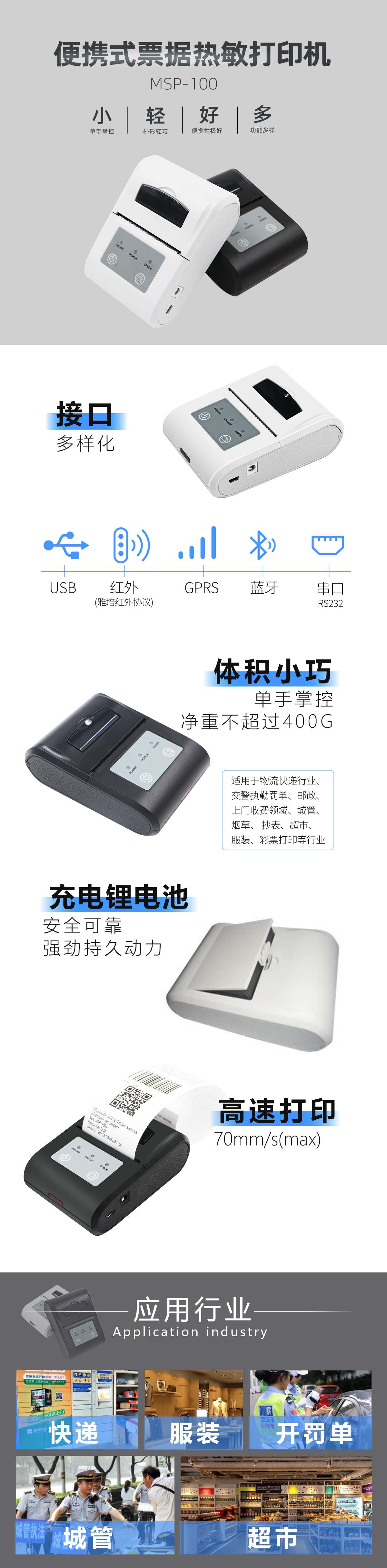 美松MSP-100打印機58mm微型熱敏POS小票據(jù)打印機,支持紅外(雅培紅外協(xié)議)接口,GPRS接口,USB接口,藍牙接口,串口RS232接口,鋰電池充電,適應用于物流快遞行業(yè),交警執(zhí)勤罰單,郵政,上門收費領域,城管,煙草,抄表,超市,服裝,彩票打印等行業(yè)的使用.支持多種一維條形碼&二維碼功能的打印,支持GB18030漢字庫,可高速打印漢字.