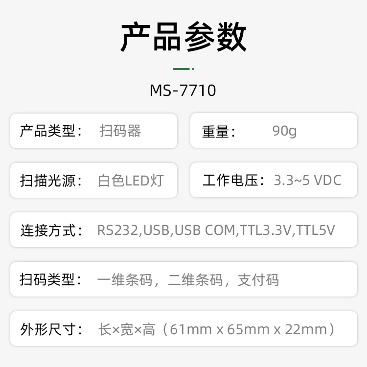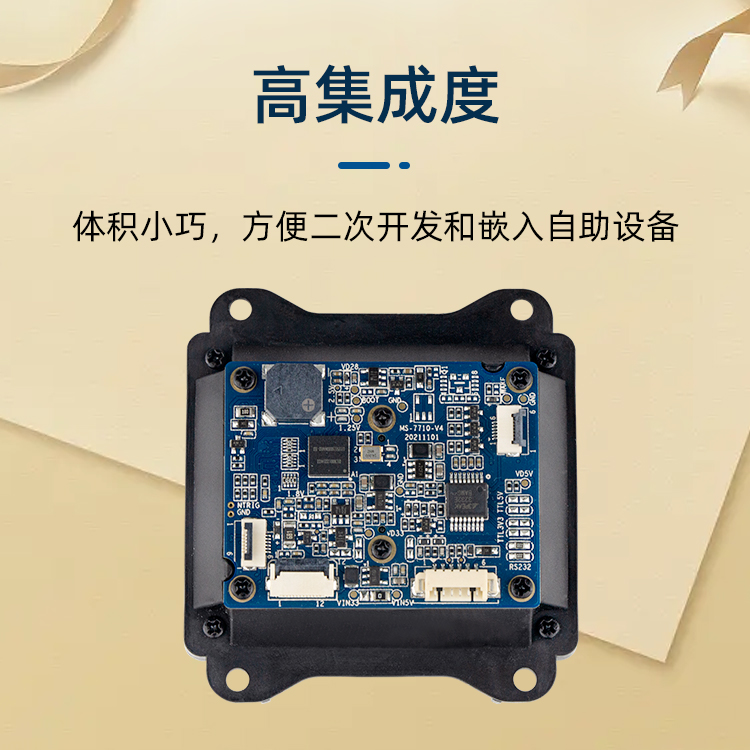 美松二維碼掃描模塊MS-7710采用遠(yuǎn)距離圖像傳感器,支持遠(yuǎn)距離識(shí)讀;針對(duì)陽光和夜晚模式進(jìn)行優(yōu)化,全天24小時(shí)均可正常識(shí)讀,無人值守更省人工;兼容紙質(zhì)條碼掃描,為停車券應(yīng)用量身定制;寬溫-30~70度,南方北方輕松應(yīng)對(duì);豐富的接口適用各種傳輸方式;寬電壓設(shè)計(jì),供電更靈活,避免單獨(dú)再拉供電電源.圖像采集器與解碼板一體化設(shè)計(jì),重量極輕,集成度高,極易嵌入到各種產(chǎn)品應(yīng)用中,如公交掃描,自助機(jī)掃描,閘機(jī)掃描,取票機(jī)掃描,寄存柜掃描,智能門禁掃描.
