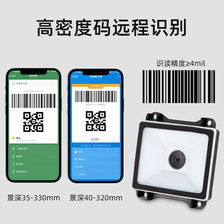 美松二維碼掃描模塊產(chǎn)品特性 1.快速識(shí)別紙質(zhì)和屏幕條碼,破損污損二維碼均能識(shí)讀 2.接口豐富,內(nèi)置RS232,USB,TTL5V,TTL3.3V 3.高集成度,21mm厚小機(jī)身,非常方便的用于高度集成應(yīng)用環(huán)境 4.綠色低功耗,產(chǎn)品使用壽命長;數(shù)據(jù)傳輸更加安全可靠 5.采用核心解碼技術(shù),可快速識(shí)讀各類紙質(zhì),塑料卡,屏幕條形碼,二維碼 6.圖像采集器與解碼板一體化 設(shè)計(jì),體積小,重量輕,可適應(yīng)各種集成應(yīng)用