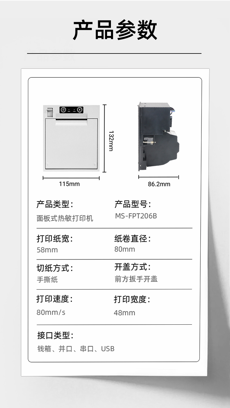美松MASUNG新推出的58mm面板式熱敏打印機(jī) 1.MS-FPT206面框可以兼容80mm打印機(jī)安裝尺寸 2.擁有易裝紙、手撕切紙等功能 3.設(shè)計(jì)精巧,操作簡(jiǎn)易等特點(diǎn) 4.開(kāi)蓋扳手加軸強(qiáng)度高、黑標(biāo)傳感器(可選)等優(yōu)良特性 5.零售、餐飲、娛樂(lè)、醫(yī)療、物流等行業(yè)的自助終端設(shè)備理想打印伙伴