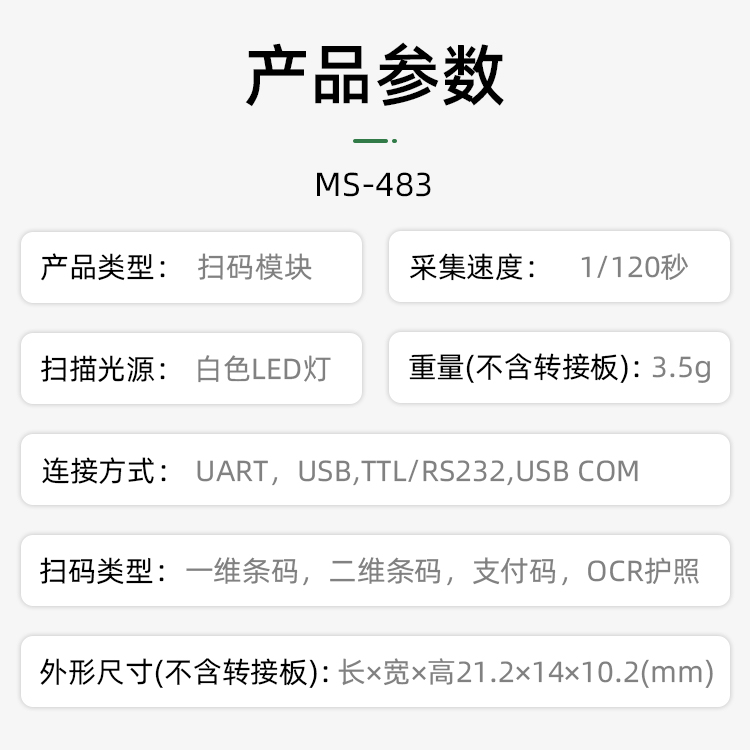 兼具一維/二維碼;紙質(zhì)和手機碼掃描 3.9mil精度條碼掃描 工業(yè)級電路防護設計 十字激光光標指示 OCR身份證號碼讀取功能(選配) 選配轉(zhuǎn)接板可端子線連接RS232,TTL3.3V,TTL5V,USB,USB虛擬串口