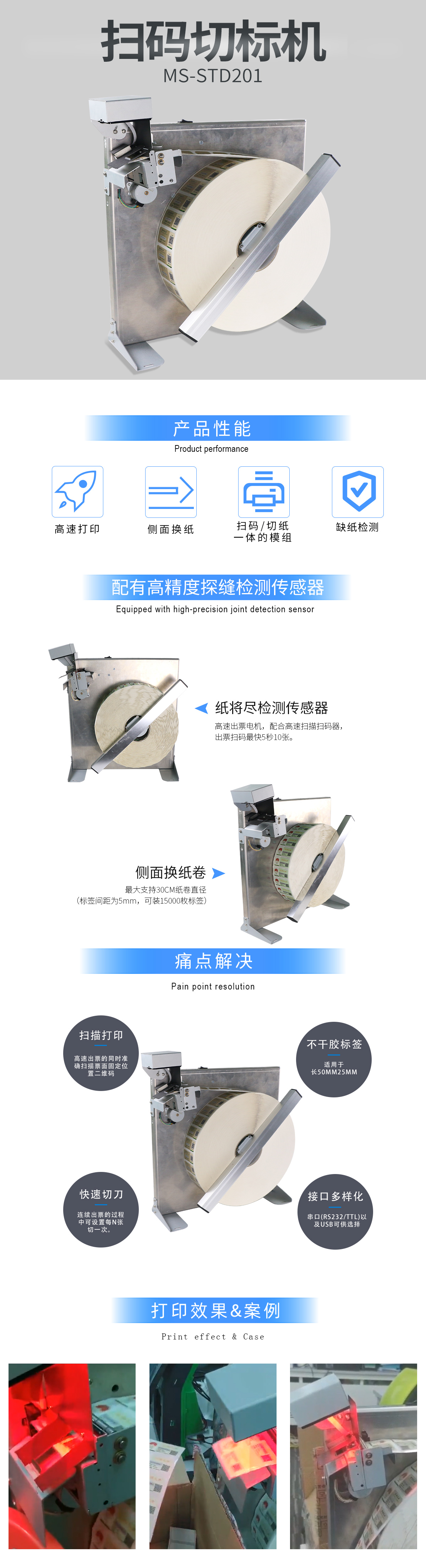 美松品牌MASUNG掃碼切標(biāo)機MS-STD201是一套集出票、掃碼、切紙為一體的模組。對于自帶二維碼的不干膠票紙,可以在高速出票的同時快速掃碼,還可以設(shè)定出固定張數(shù)的票后切紙,適用于把標(biāo)簽掃碼錄入后再用于商品包裝粘貼的情況。