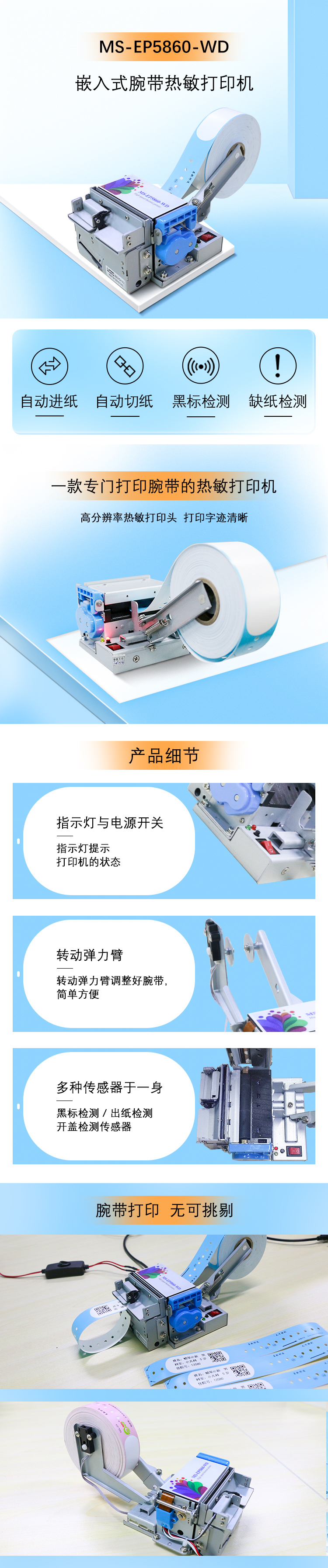 MS-EP5860-WD 是一款專門打印腕帶的熱敏打印機,特點如下: 1、可裝入紙卷直徑最大可允許 120mm; 2、紙架可以打開,可側(cè)開裝紙; 3、體型小、機頭高度低,適合小空間安裝; 4、有出紙檢測傳感器,腕帶有沒有被拿走,狀態(tài)清晰; 5、適合市場常見各種寬度熱敏腕帶
