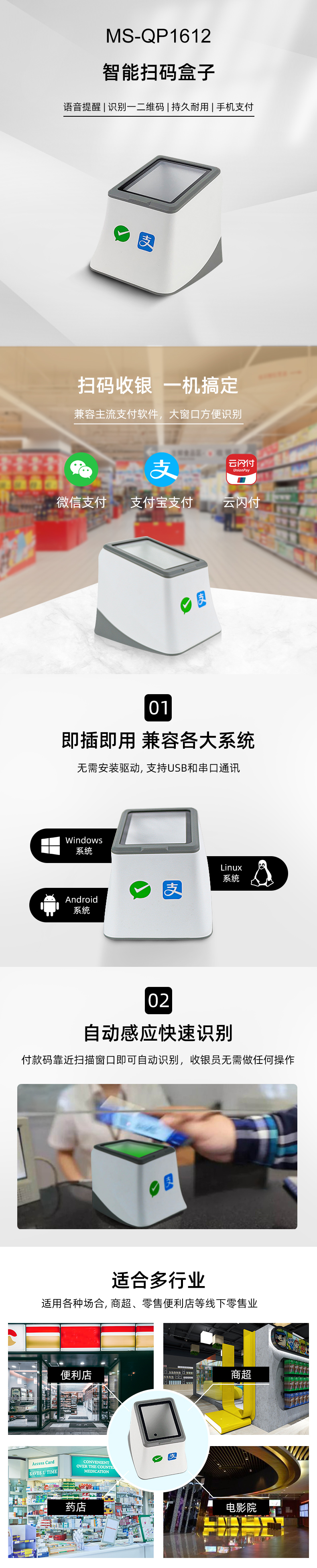 1.大窗口,經(jīng)典外觀,支持貼屏掃碼 2.支持微信、支付寶、美團(tuán)等掃碼支付 3.掃碼成功語(yǔ)音播報(bào) ,解放收銀員,避免漏單 4.接口豐富,內(nèi)置RS232 和USB接口