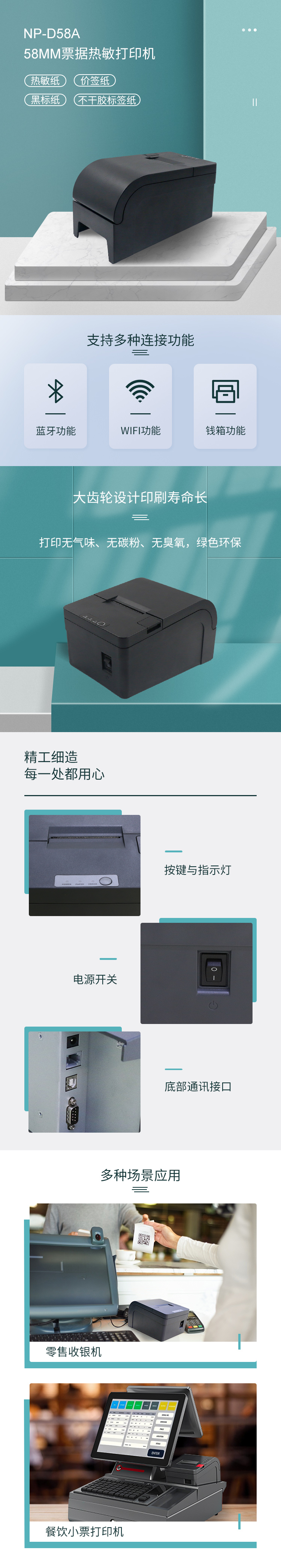 1.易裝紙,手撕切紙 2.大齒輪設計打印壽命長 3.支持價簽紙,熱敏紙,黑標紙,不干膠標簽紙打印功能 4.小巧機身,適用于狹窄的柜臺空間 5.人性化設計,紙倉開啟角度寬,裝紙維護便捷