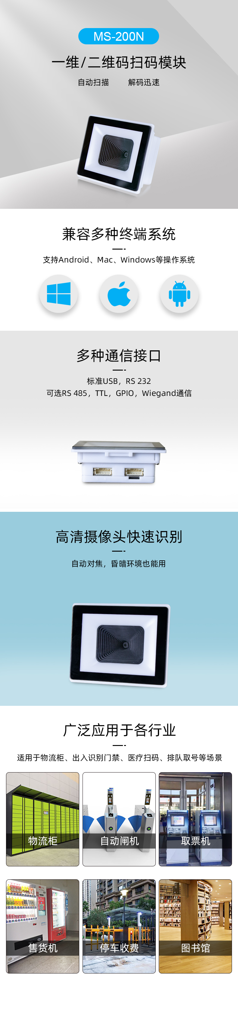 1.領先的解碼技術 采用自主研發(fā)的核心技術,極速響應, 2.讀取各種條碼 一維/二維,紙質/手機讀碼 3.寬電壓供電 默認3.61-5V供電,可選3.3-16V寬電壓電源 4.多種通訊方式 標準USB、RS232; 可選RS485、TTL、GPIO、韋根通訊 5.OCR 讀取 可讀的 OCR-A/B 數(shù)字(可選) 6.NFC 刷卡 可選刷卡模塊可支持13.56Mhz,非接觸式IC讀卡器,支持Type A/B卡