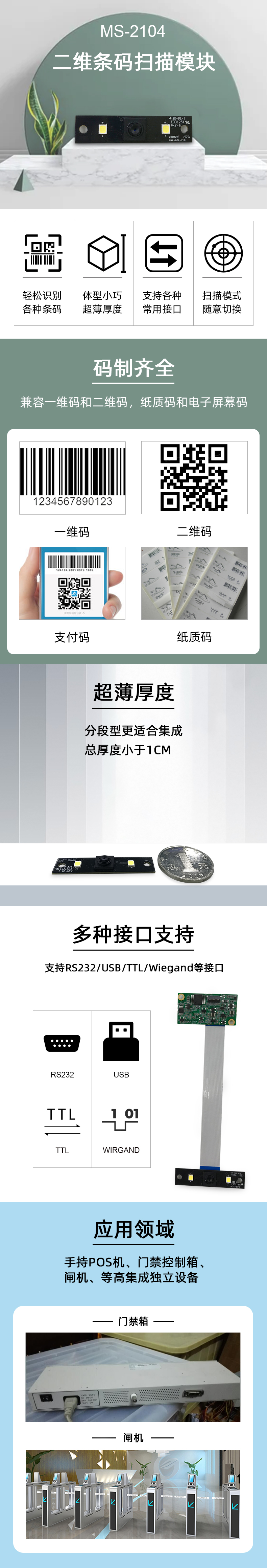 美松固定式二維掃描模組MS-2104掃描采用廣角鏡頭,適合近距離識(shí)讀,支持紙質(zhì)和電子屏,支持全碼制條碼識(shí)讀,增加陽光下濾鏡算法,非常適合門禁和陽光下的應(yīng)用.自帶補(bǔ)光燈,無需另外配備.采用鏡頭和解碼板分離,厚度低于1CM,結(jié)構(gòu)更自由,非常適合超薄結(jié)構(gòu)件的設(shè)計(jì).豐富接口類型兼容USB,RS232,485,TTL3.3/5V,韋根;寬壓設(shè)計(jì)3.3-16V,寬溫設(shè)計(jì),支持-30~70℃環(huán)境下使用.