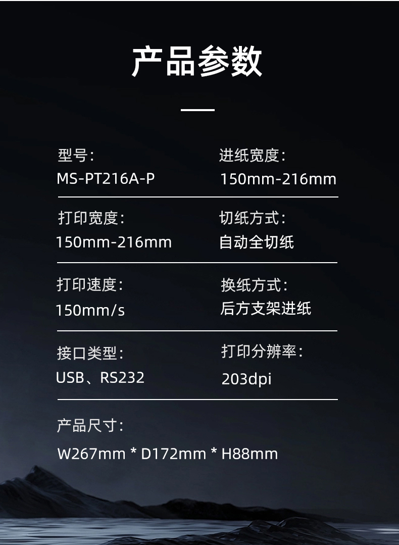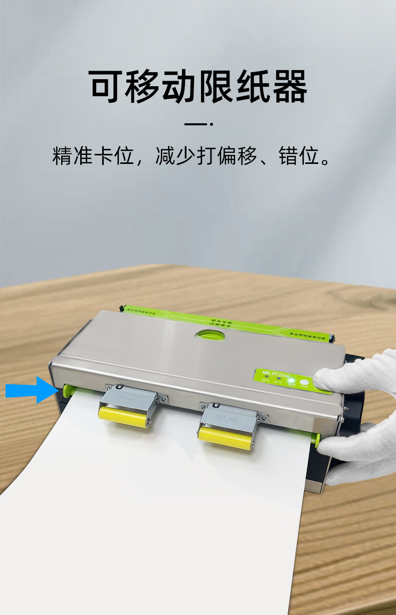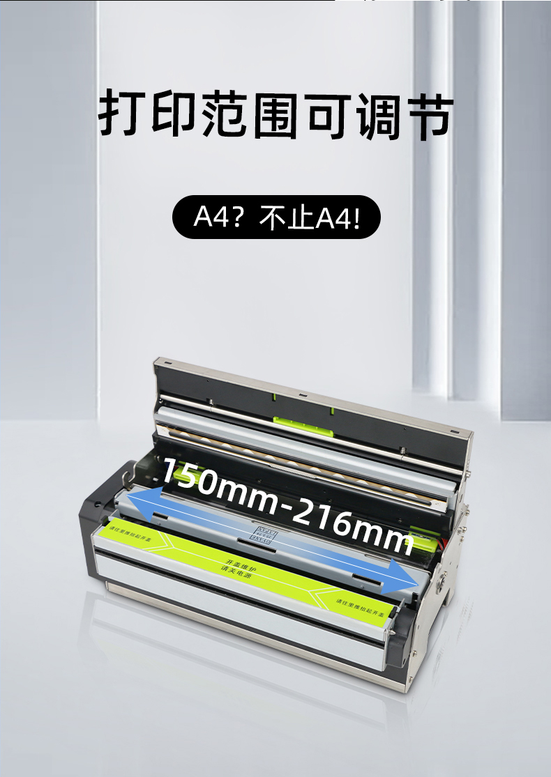 MS-PT216A-P_A4熱敏打印機(jī), 一款全新大幅面熱敏打印機(jī),打印寬度150mm-216mm可調(diào)節(jié)。 體積尺寸相比同類產(chǎn)品更為小巧。 打印速度可達(dá)150mm/s 有效容紙,杜絕打印過程中拉扯造成的卡紙 先打印完成并切紙,一次性把紙送出 容紙器可開蓋,維護(hù)方便快捷